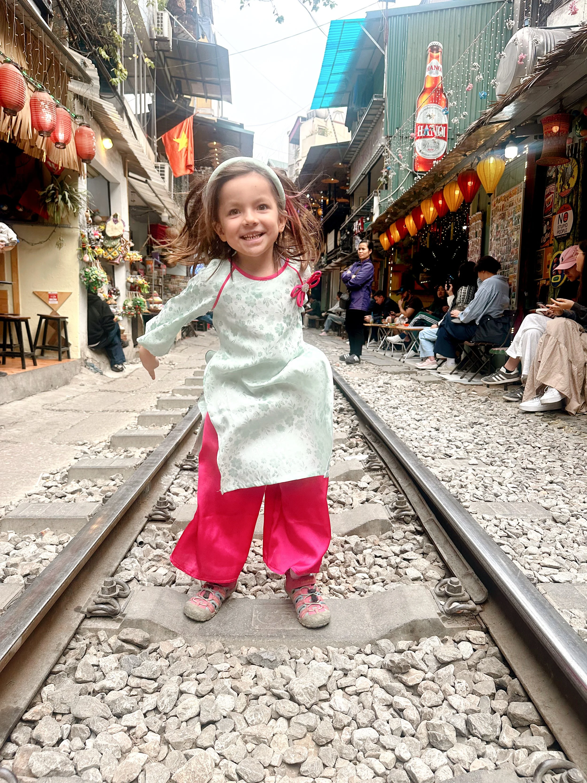 My Daughter on train street Hanoi, Vietnam.
